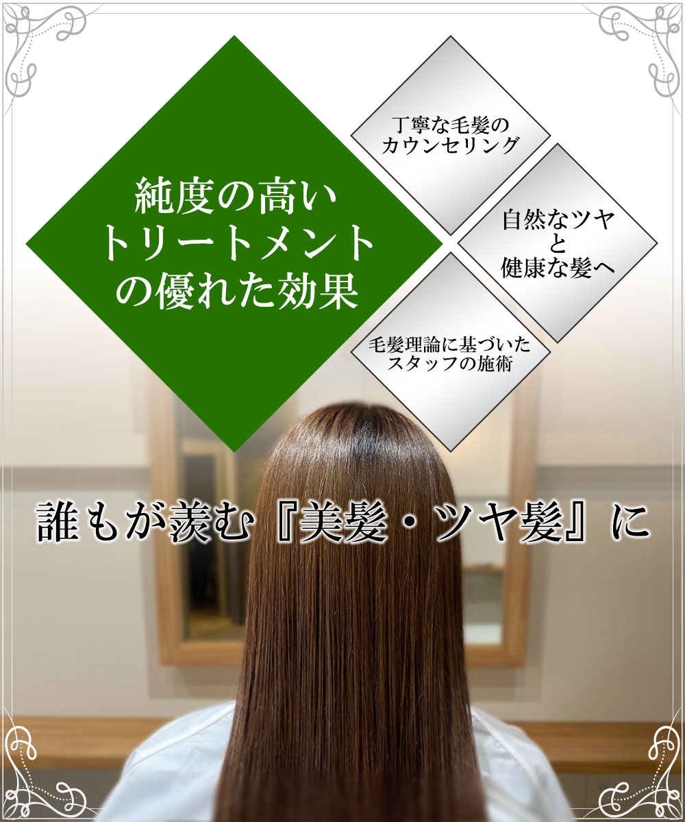純度の高いトリートメントによって自然なツヤ、髪本来の柔らかさを取り戻します。